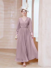 V-neck Long Sleeves Pleated Ruched Dress Dusk
