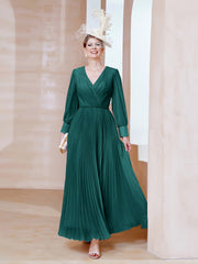 V-neck Long Sleeves Pleated Ruched Dress Peacock