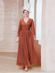 V-neck Long Sleeves Pleated Ruched Dress Rust