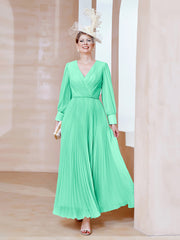 V-neck Long Sleeves Pleated Ruched Dress Turquoise