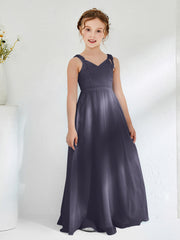 V-neck Ruched Floor-length Junior Bridesmaid Dresses Stormy